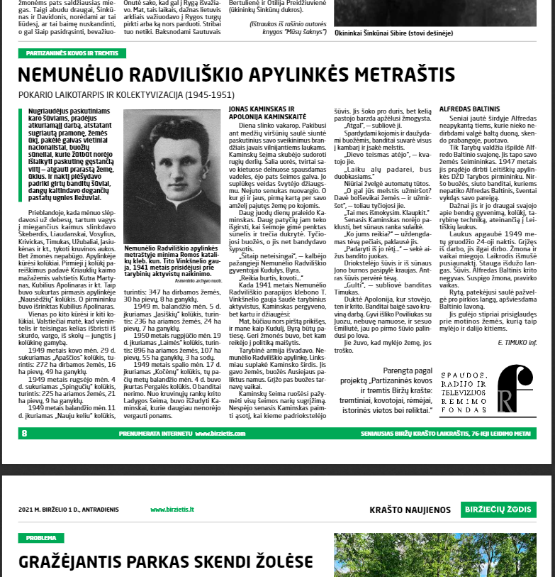 Iš sovietinių šaltinių be jokio komentaro perspausdintas pokario laikus aprašantis tekstas laikraštyje „Biržiečių žodis“ išpublikuotas su SRTRF logotipu ir nuoroda, jog tai – projekto „Partizaninės kovos ir tremtis Biržų krašte: tremtiniai, kovotojai, rėmėjai, istorinės vietos bei reliktai“ dalis.