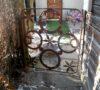 Pietų fasade yra priebutis (30 ir 31 nuotr.). Priešingoje namo pusėje – platus visiems atviras abiejų namų kiemas, o šičia nujaučiama labai kamerinė vieta su metaliniais varteliais į aną kiemą iš kitos pusės (32 nuotr.). Nematyta geometrinė – apskritimų – ir gėlės žiedų kompozicija.