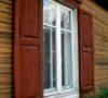 Šiame kadre ryškus ažūras, o spalvos, spalvos…; šičia žalsvai žydra. Ir dar vienas langas su jo „brolių“ puselėmis, – šitaip langai sutankinti (24 nuotr.). Vakarų fasade langinės kitokios, su įstriža (eglutės) apkala (25 nuotr.).