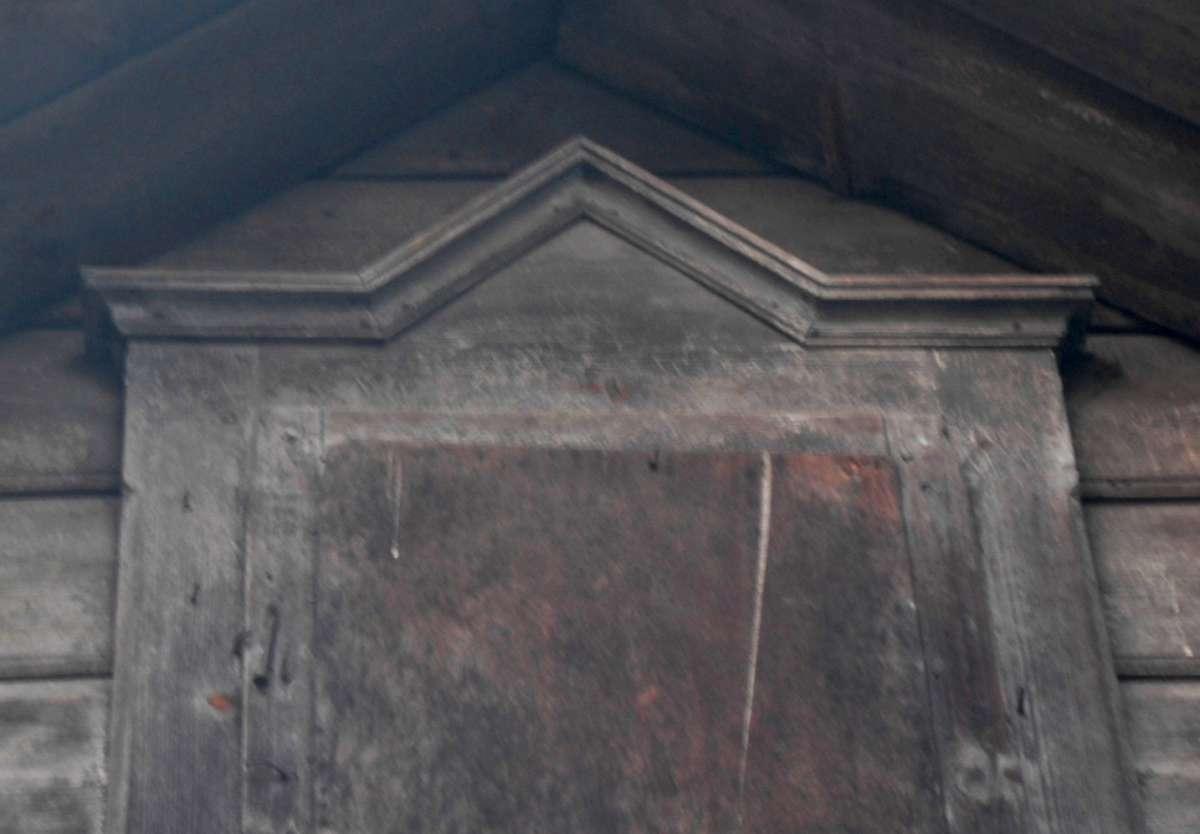 Pastarojo namo priebučio durys su pusvarčia, retas atvejis; retesnės (susiaurintos) formos ir skydeliai (15 nuotr.). Durys perdažytos, bet senoji žydroji spalva atkakliai tebeprasimuša…
