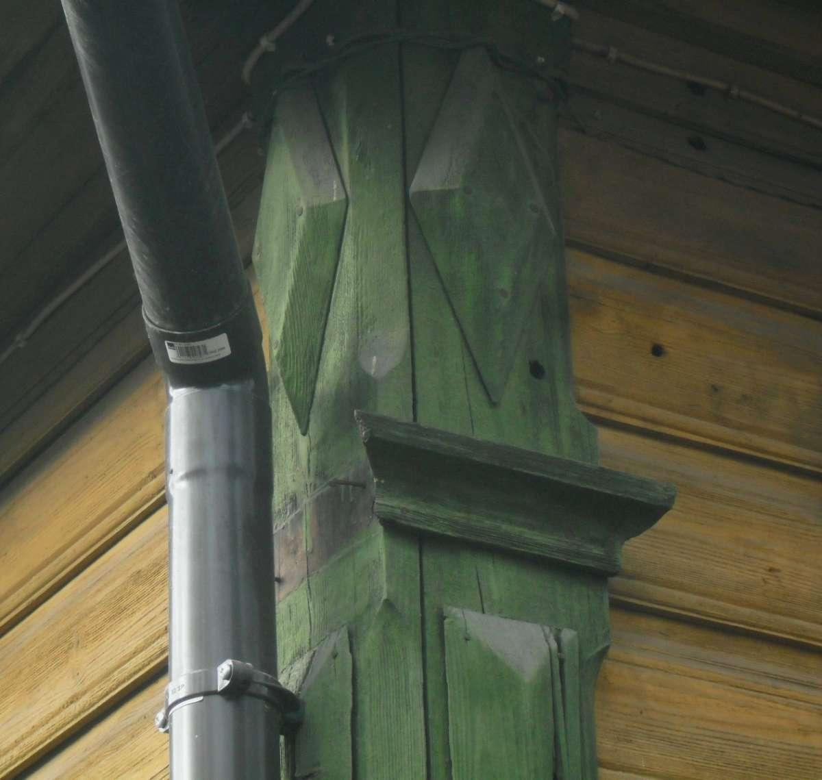 Name Nr. 17 nemažai elementų pakeista, perdirbta, bet įdomus pirminę formą (trikampis plius trapecija) su atitinkamos formos stogu, apkalos fragmentavimą ir langų išdėstymą išlaikęs stogo skydas (23 nuotr.). Išradingesnės formos ir veranda (24 nuotr.). Langinių apkaloje – eglutės motyvas kaip ir stogo skyde, tik šiam priešingas – tiesioginė atmaina.
