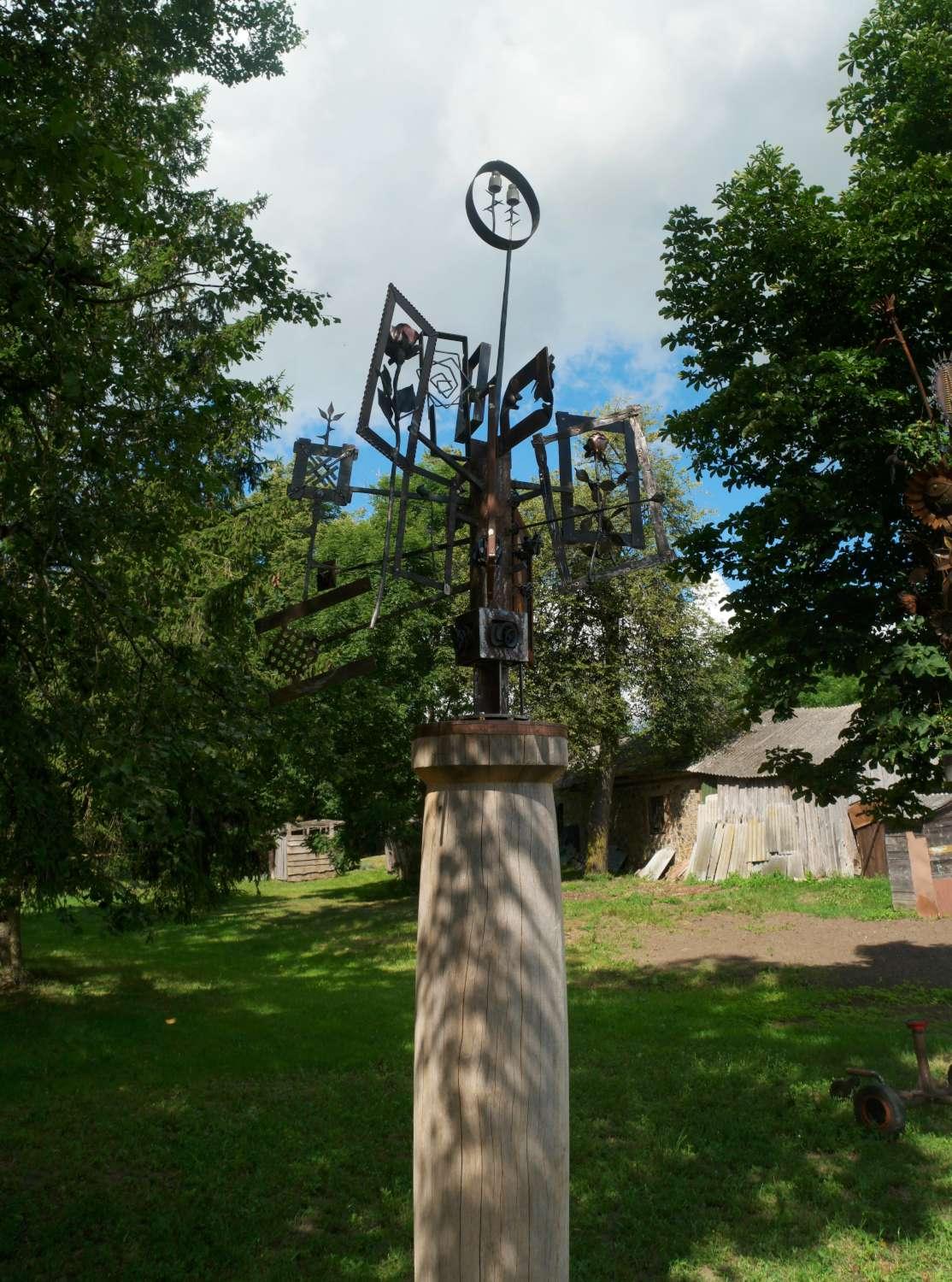 Meno stovykloje kūrę kalviai iš savo atskirai sukurtų visiškai skirtingų ,,rožių“ pavidalų (nuo realistiškesnių skulptūrinių iki dekoratyvių – ornamentinių ar ženklinių, o taip pat technogeninių objektų elementų) sukomponavo ir ant medinės kolonos įtaisė grupinę kalvišką nedažytos geležies (vietomis praturtinti kitų metalų elementais) skulptūrą ,,Rožės“. Joje ryškėja paveikslų rėmuose žydinčių rožių šakelių motyvai – tiek realistiškesni, tiek įvairių ornamentinių darinių (spiralės-meandro, geometrinio rombo su ataugėlėmis ir kt.).