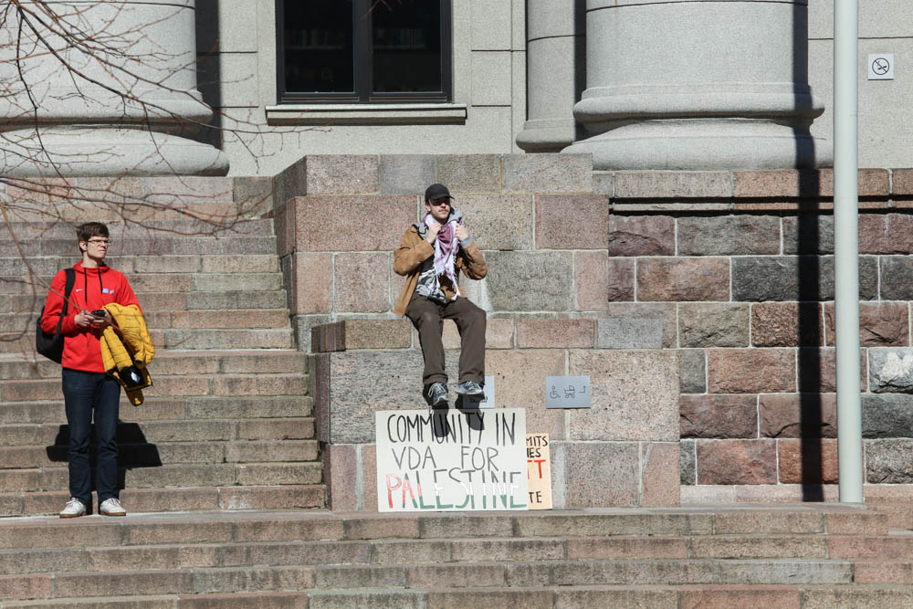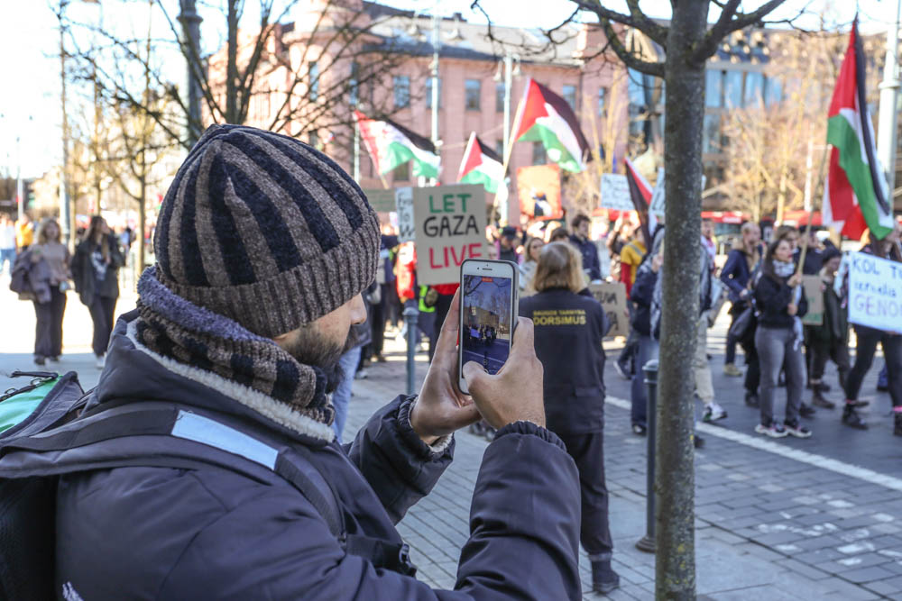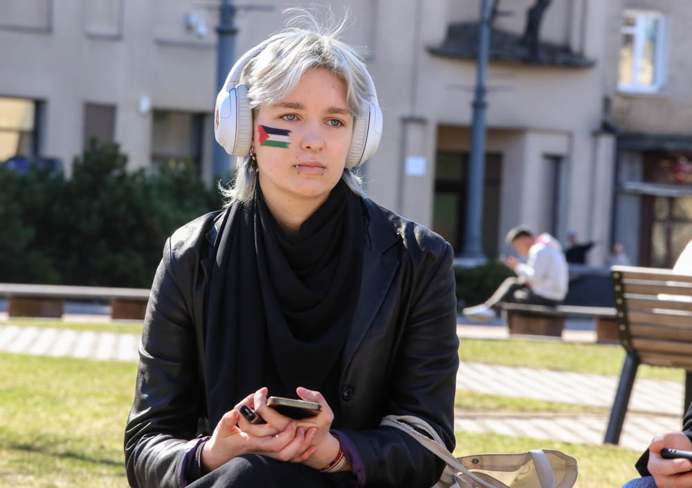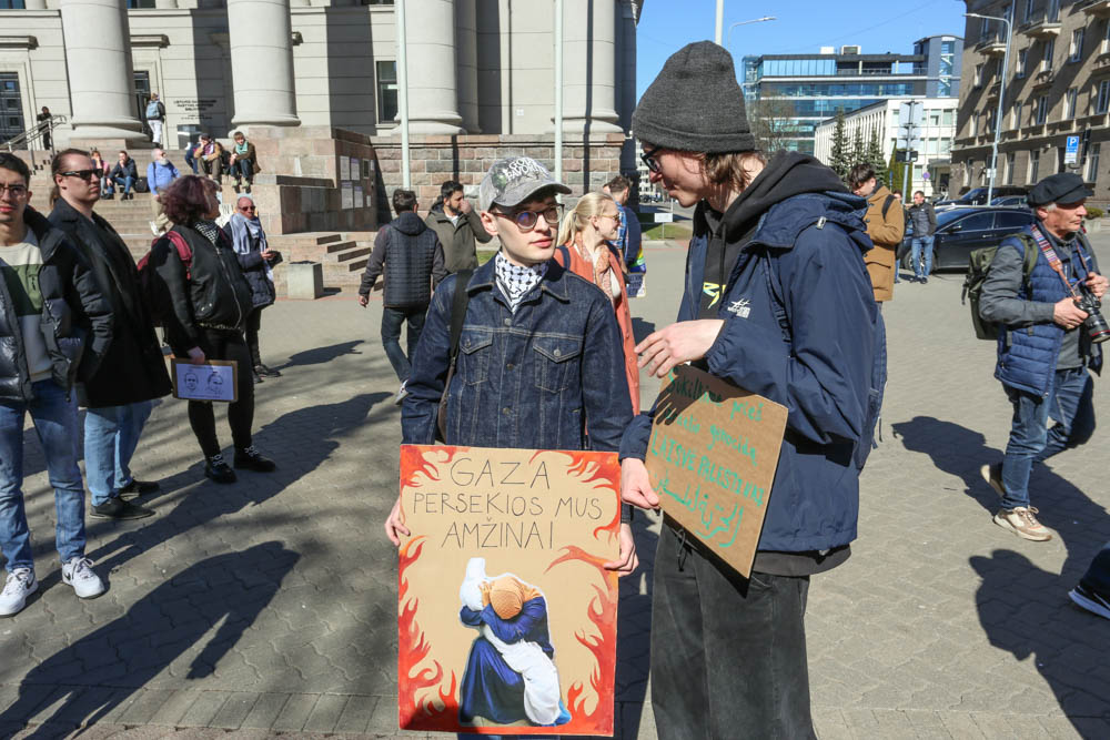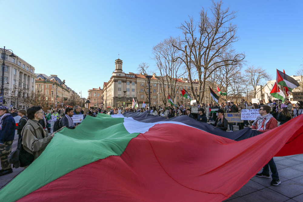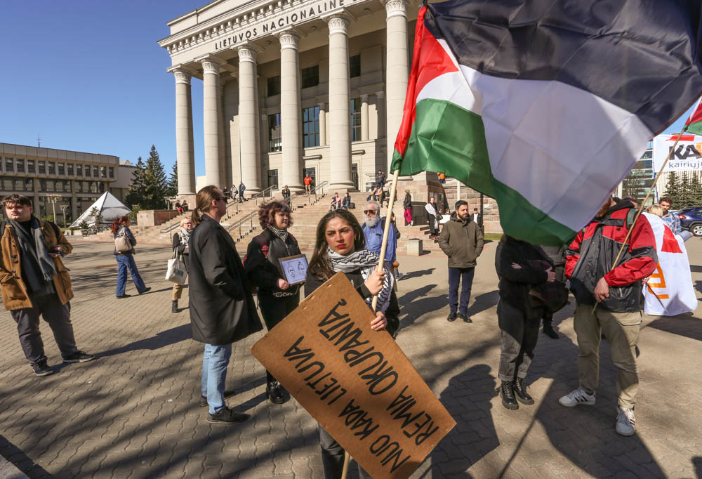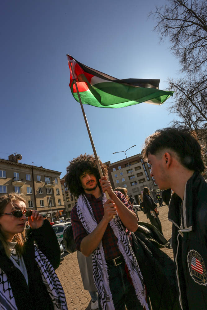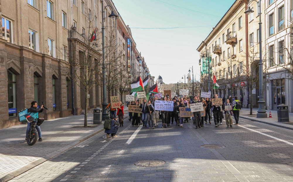 Kovo 29-osios popietę sostinės Gedimino prospekte aidėjo būgnai, plazdėjo Palestinos vėliavos, skambėjo šūkiai „Laisvė Palestinai, laisvė Ukrainai“.