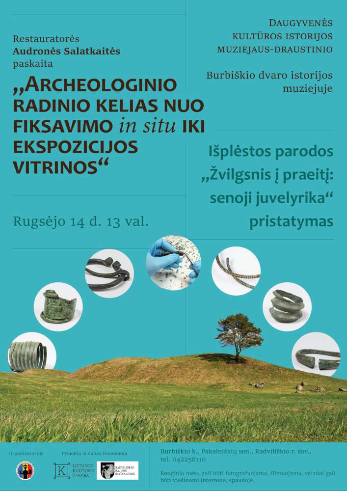 Rugsėjo 14 dieną 13 valandą Daugyvenės kultūros istorijos muziejaus-draustinio Burbiškio dvaro istorijos muziejuje (Radviliškio r.) vyks archeologijai skirtas renginys – restauratorė Audronė Salatkaitė skaitys paskaitą „Archeologinio radinio kelias nuo fiksavimo in situ iki ekspozicijos vitrinos“, bus pristatyta išplėsta paroda „Žvilgsnis į praeitį: senoji juvelyrika“.