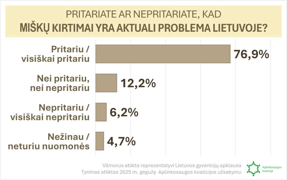 76,9 proc. apklausos respondentų į klausimą „Pritariate ar nepritariate, kad miškų kirtimai yra aktuali problema Lietuvoje?” atsakė „visiškai pritariu“ arba „pritariu“, 12,2 proc. nei pritaria, nei nepritaria, ir tik 6,2 proc. nurodė nepritariantys arba visiškai nepritariantys.