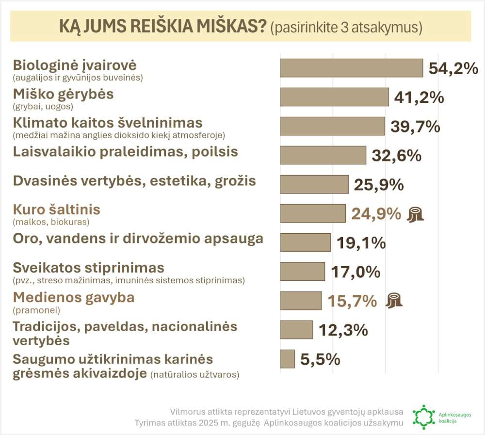 Vilmorus apklausą užsakė Aplinkosaugos koalicija, kad būtų žinomos visuomenės nuostatos. Apklausa aiškiai parodo, kad visuomenei miškas ir jame esančios gamtinės aplinkos apsauga yra labai svarbūs, o medienos gavyba respondentų toli gražu nėra įvardijama kaip svarbiausia miškų teikiama nauda.