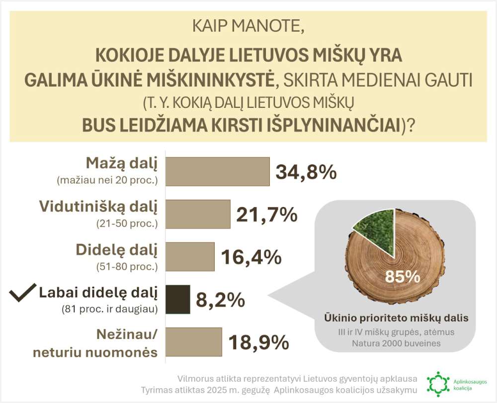 Didžioji dalis gyventojų mano, kad miškai mažiau naudojami medienos gavybai, nei iš tikrųjų yra. Miškų kirtimus daugelis laiko opia problema ir nori, kad daugiau miškų būtų saugomi. Tokias visuomenės nuostatas atskleidžia gegužės mėnesį Visuomenės nuomonės ir rinkos tyrimų centras Vilmorus atlikta reprezentatyvi Lietuvos gyventojų apklausa „Nuomonė apie miškų kirtimą, ūkinę veiklą, rekreacinių plotų didinimą“. Apklausos rezultatai itin reikšmingi šiuo metu, kai Seimui svarstyti ruošiamasi pateikti naują Aplinkos ministerijos paruoštą Miškų įstatymo projektą.