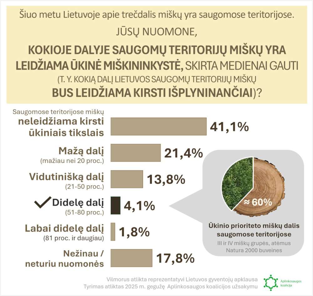 Panašią situaciją rodo ir respondentų atsakymai į apklausos klausimą „Jūsų nuomone, kokioje dalyje saugomų teritorijų miškų yra leidžiama ūkinė miškininkystė, skirta medienai gauti (t. y. kokią dalį Lietuvos saugomų teritorijų miškų bus leidžiama kirsti išplyninančiai)?“. Šiuo metu maždaug 60 proc. saugomų teritorijų miškų yra ūkinio prioriteto miškai (IV ir III grupės miškai, neįskaitant juose esančių Natura 2000 saugomų buveinių ploto).