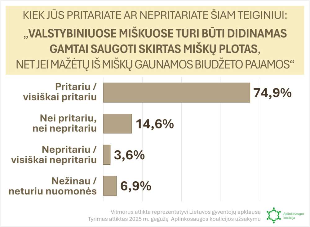 Teiginiui „Valstybiniuose miškuose turi būti didinamas gamtai saugoti skirtas miškų plotas, net jei mažėtų iš miškų gaunamos biudžeto pajamos“ pritarė dar didesnė respondentų dalis – 74,90 proc., o neigiamai pasisakė vos 3,60 proc.