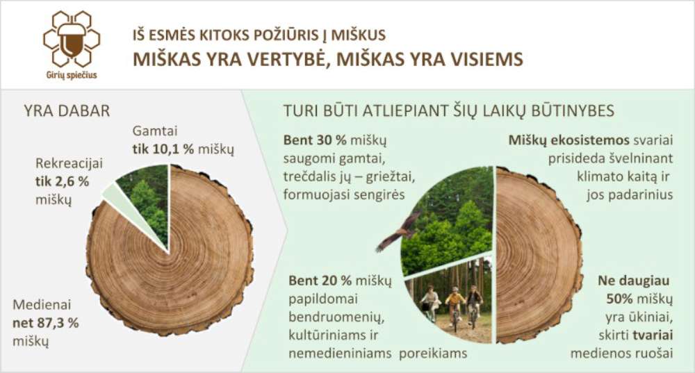 Lietuvos visuomenė vertina mišką kaip savaiminę vertybę, svarbią dvasinei ir fizinei sveikatai. Daugiau nei pusė Lietuvos biologinės įvairovės yra susijusi su miškų ekosistemomis. Tuo pačiu šalies miškai reikšmingai prisideda švelninant klimato kaitą. Todėl gamtą alinančios, brandaus miško nepaliekančios miškininkystės praktikos privalo keistis.