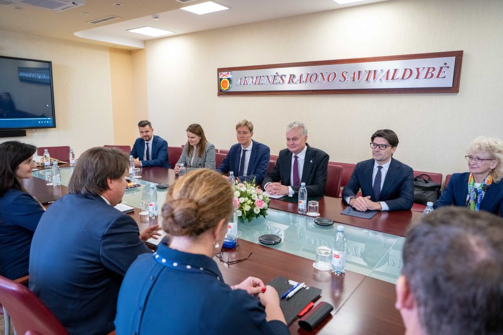 Prezidentas Gitanas Nausėda su komanda antradienį dirba Akmenės rajone, kur susitiko su rajono meru Vitalijumi Mitrofanovu. Pagrindinės susitikimo temos – regioninių kelių būklė, žaliųjų energijos projektų reguliavimas, finansavimo iššūkiai ir valstybės funkcijų perdavimas savivaldybėms.