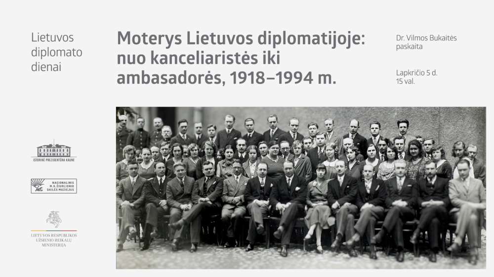 Lapkričio 5 d., trečiadienį, 15 val. Nacionalinio M. K. Čiurlionio dailės muziejaus Istorinėje Prezidentūroje Kaune (Vilniaus g. 33) vyks istorikės dr. Vilmos Bukaitės paskaita „Moterys Lietuvos diplomatijoje: nuo kanceliaristės iki ambasadorės, 1918–1994 m.“, skirta Lietuvos diplomato dienai.