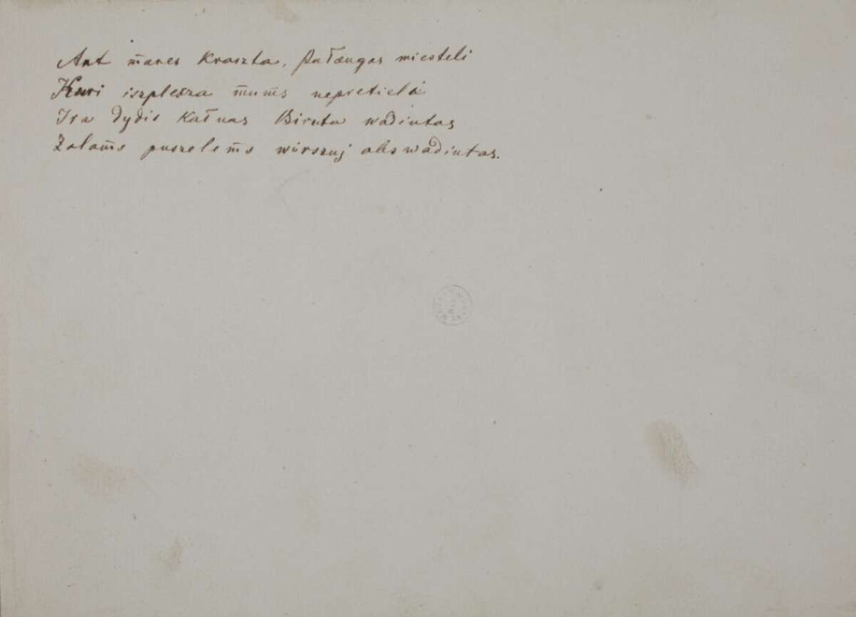 Rengiant tarptautinės parodos „Senoji Lietuva Napoleono Ordos akvarelėse“ katalogą, atidžiai peržiūrėjome visus su Lietuvos Didžiąja Kunigaikštyste susijusius vaizdus. Aptikęs eilėraščio posmą lietuvių kalba ir neradęs mokslininkų komentarų apie šį užrašą anksčiau skelbtuose tyrimuose, susidomėjau.